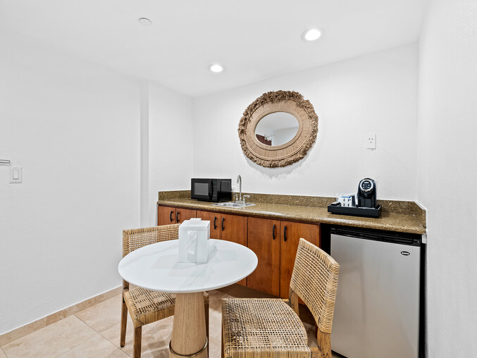 Feel right at home in this spacious oceanfront suite. Perfect for couples or small families, this suite features a refrigerator, microwave, wet bar sink, a living room with sleeper sofa, a small dining area and workspace, and accompanying luxurious amenities.