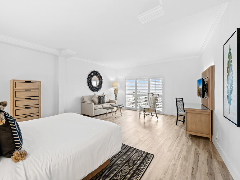 Overlooking the main pool, the Partial Ocean View Junior Suites are in the main hotel tower as well as on the 2nd floor of our completely renovated Cabana building which sits directly opposite the resort's main hotel tower. These larger rooms rooms have 1 King sized bed and queen size sleeper sofa, and include a mini fridge, microwave, and wet bar sink, as well as a furnished balcony.